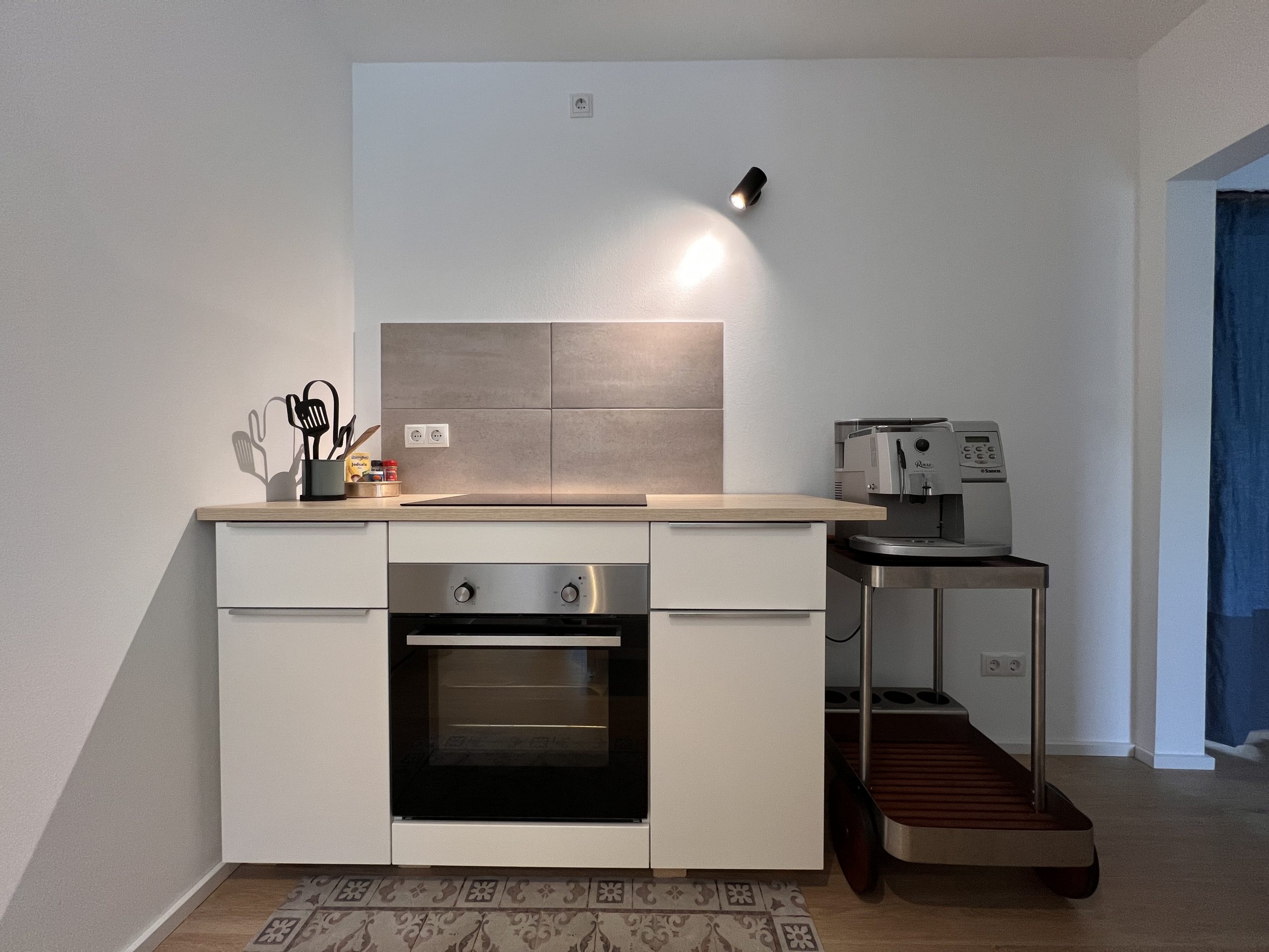 - Küche mit Herd, Ofen, Kaffeemaschine, Geschirr und Besteck. Eine komplette Grundausstattung zum Kochen: Töpfe und Pfannen, Öl, Salz und Pfeffer. Kühlschrank
